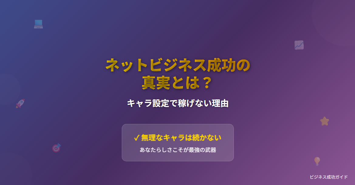 ネットビジネスを始める多くの人が陥りがちな罠があります。それは「無理なキャラクター設定」です。SNSやブログで目立とうとして作り物のキャラクターを演じ続けた結果、疲れ果てて挫折してしまうパターンが非常に多いのです。