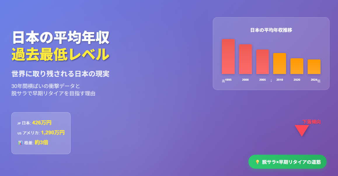 日本の平均年収が過去最低レベルにある現実は、もはや否定できません。他の先進国が右肩上がりの成長を続ける中、日本だけが20年間横ばいという状況は、従来の働き方の限界を明確に示しています。