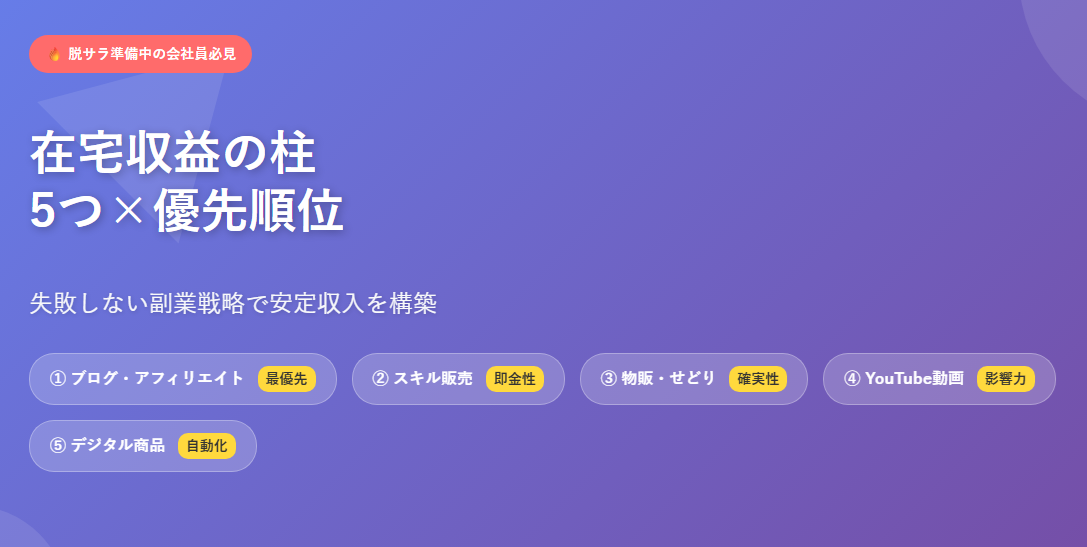 そこで今回は、 私が実際に試行錯誤して 見つけた 「在宅でできる収益の柱5つ」 とその「優先順位」を 具体的にお伝えします。