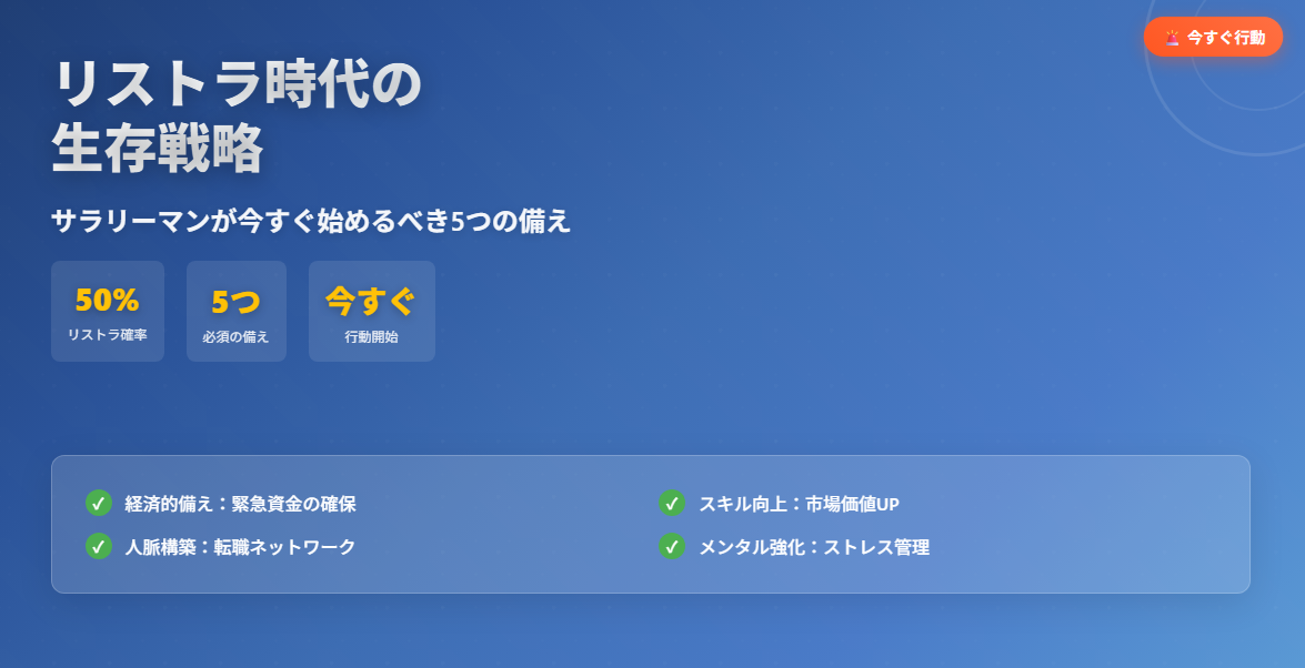 現代は確実に「備えなければ生き残れない時代」に突入しています。しかし、適切な準備をしている人にとっては、変化をチャンスに変える絶好の機会でもあります。