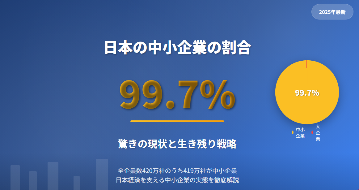 **日本の中小企業数は約420万社で、全企業数の99.7%を占めています。**この数字を見ると、日本経済がいかに中小企業に支えられているかが分かります。