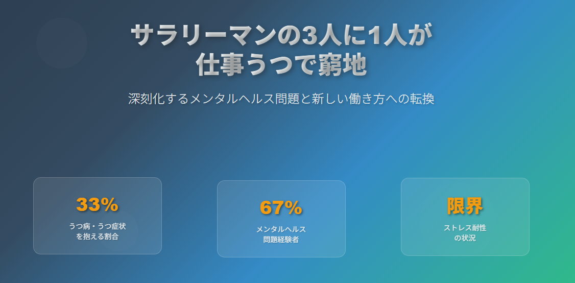 最新の調査によると、日本のサラリーマンの約33%が仕事に関連したうつ病またはうつ症状を抱えています。さらに深刻なのは、軽度の症状を含めると、実に3人に2人(約67%)が何らかのメンタルヘルス上の問題を経験していることです。