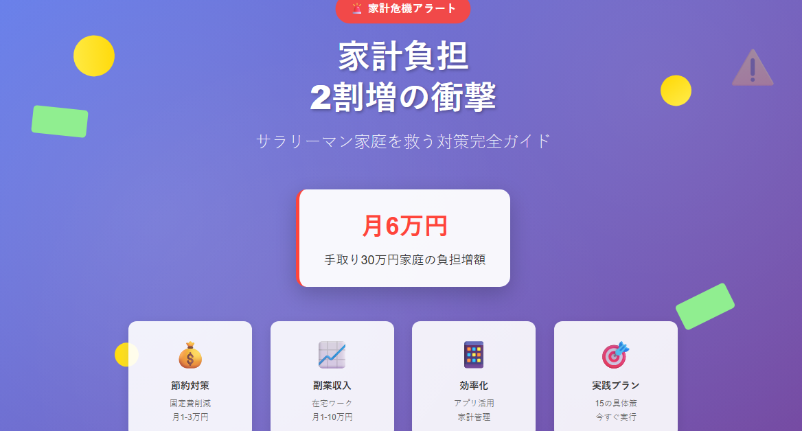 昨今の経済情勢の変化により、多くの家庭で家計負担が2割増加する可能性が高まっています。手取り30万円の標準的なサラリーマン家庭の場合、月6万円という大きな負担増となり、これまでの家計管理では対応が困難な状況です。