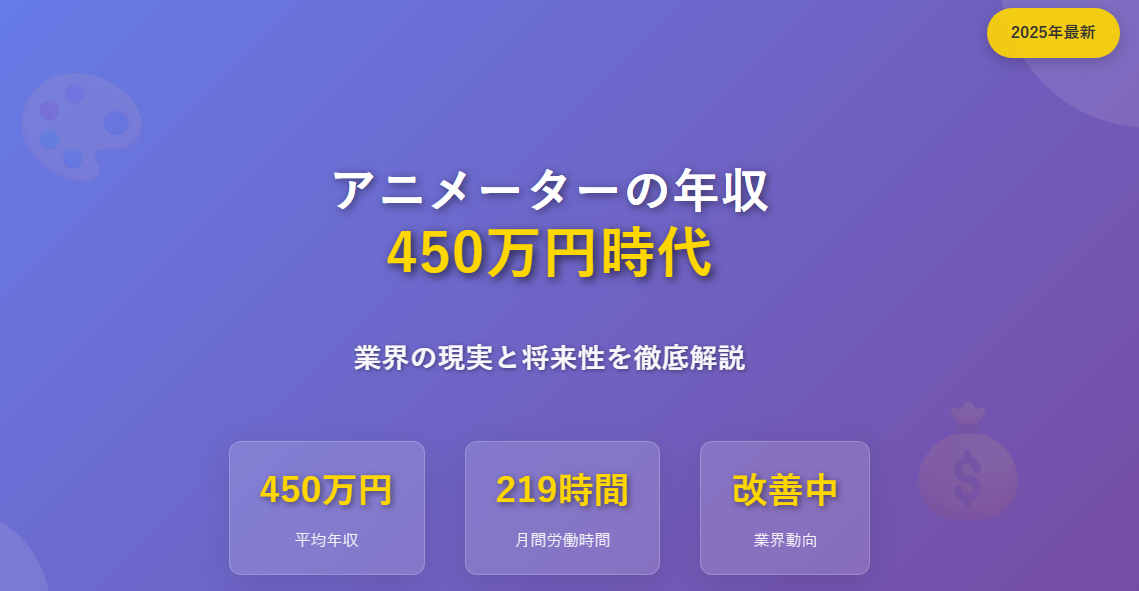 アニメーター業界の年収問題は、過去の「年収110万円」時代と比較すると改善の兆しが見えています。2025年の平均年収は約450万円と推定されており、業界全体としては上昇傾向にあります。